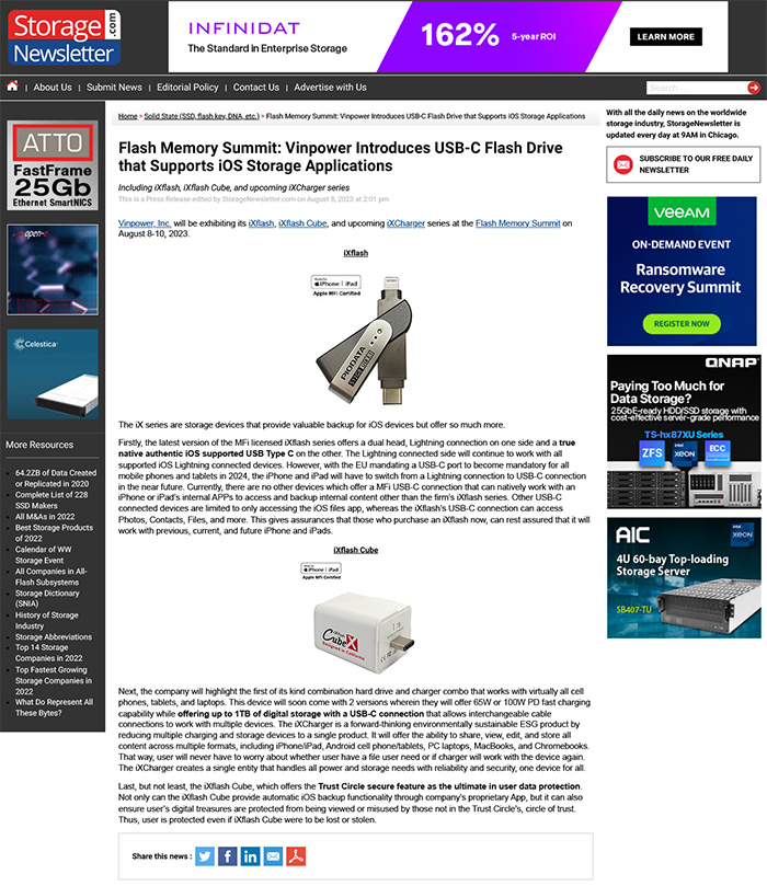 Vinpower, Inc. will be exhibiting its iXflash, iXflash Cube, and upcoming iXCharger series at the Flash Memory Summit on August 8-10, 2023.